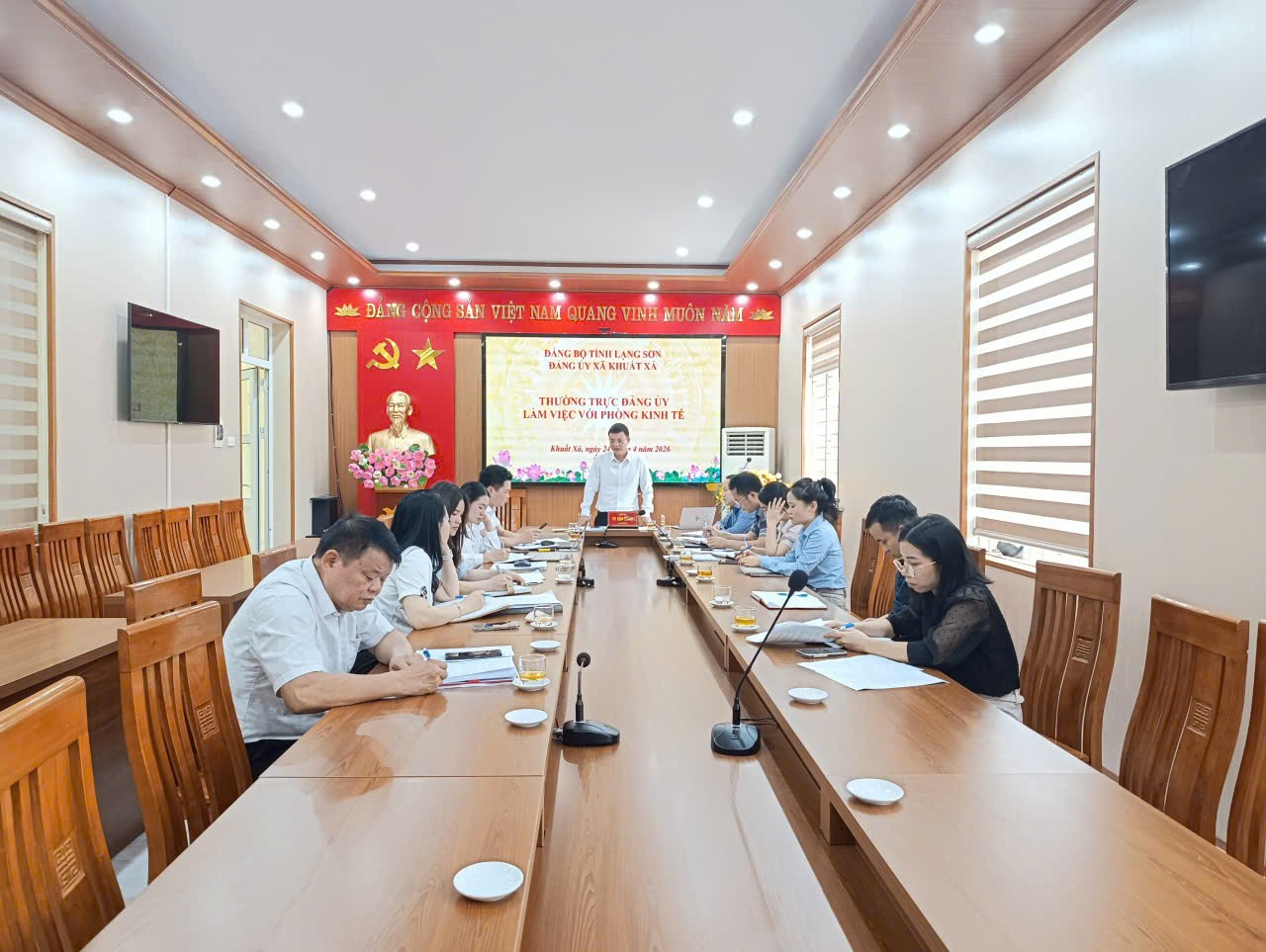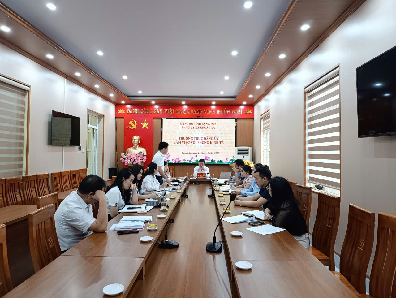 Sáng ngày 24/4/2026, Thường trực Đảng uỷ xã Khuất Xá tổ chức buổi làm việc với Phòng Kinh tế xã. Dự và chủ trì hội nghị có đồng chí Vy Văn Bông, Bí thư Đảng uỷ; đồng chí Phương Thị Mừng, Phó Bí thư Thường trực Đảng uỷ, Chủ tịch HĐND xã; tham dự có đồng chí Chu Văn Lợi, Phó Bí thư Đảng uỷ xã cùng các đồng chí lãnh đạo, chuyên viên Phòng Kinh tế xã.