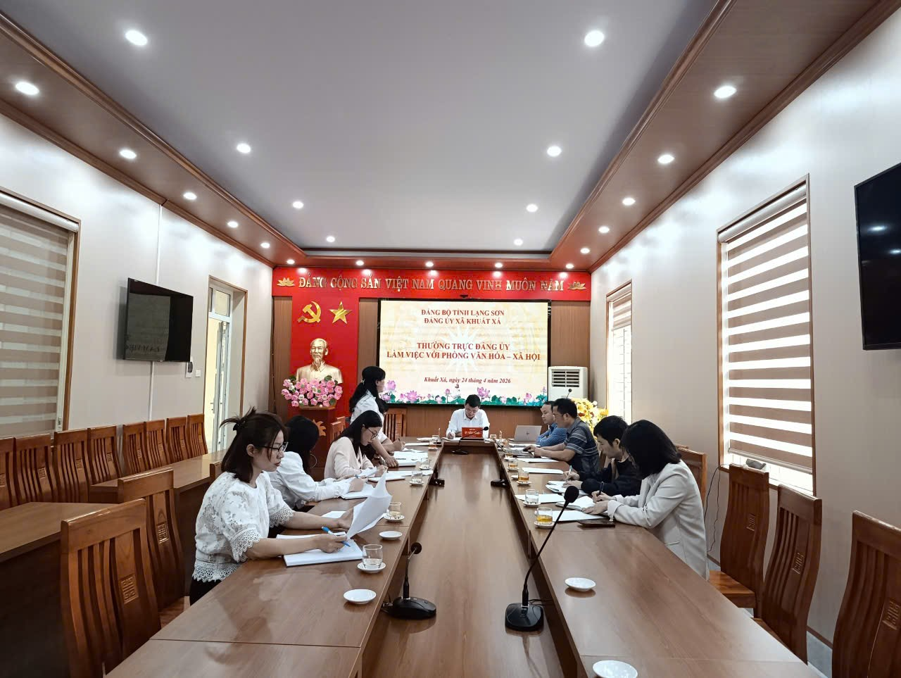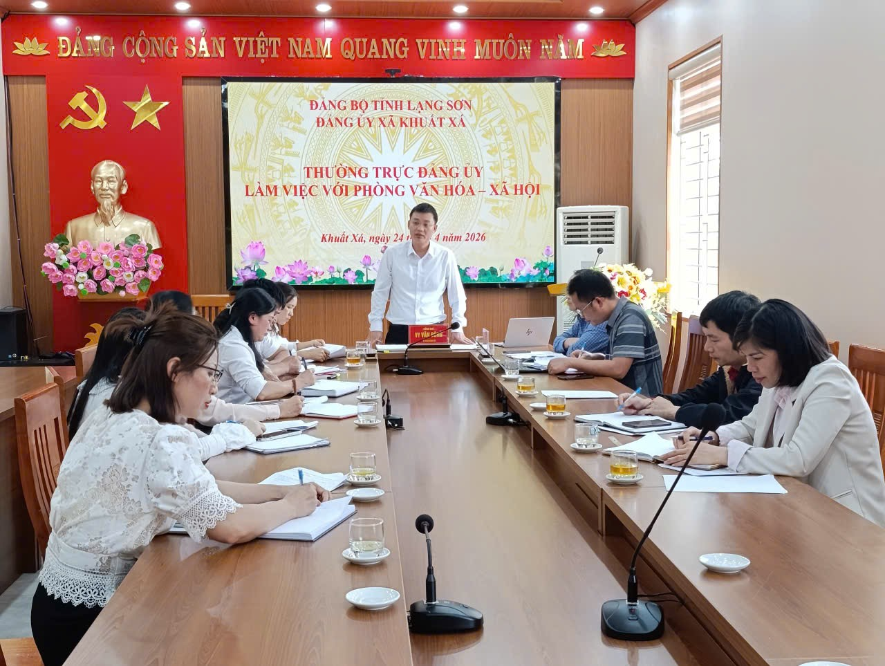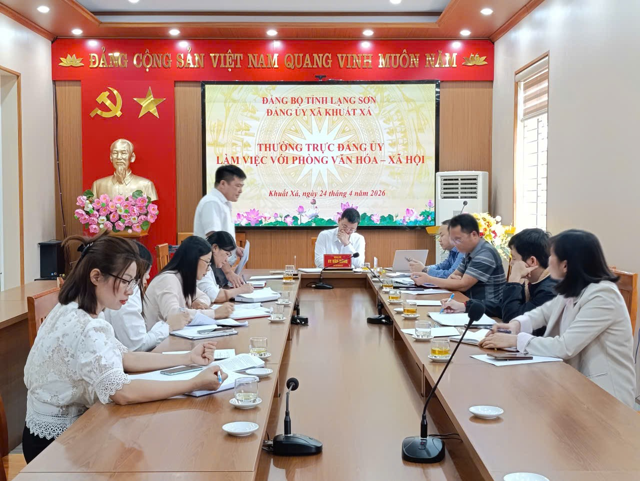 Sáng ngày 24/4/2026, Thường trực Đảng uỷ xã Khuất Xá tổ chức buổi làm việc với Phòng Văn hoá – Xã hội xã. Dự và chủ trì buổi làm việc có đồng chí Vy Văn Bông, Bí thư Đảng uỷ; đồng chí Phương Thị Mừng, Phó Bí thư Thường trực Đảng uỷ, Chủ tịch HĐND xã; tham dự có đồng chí Chu Văn Lợi, Phó Bí thư Đảng uỷ xã cùng các đồng chí lãnh đạo, chuyên viên Phòng Văn hoá – Xã hội xã.