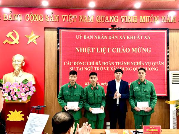Nhân dịp này, lãnh đạo xã Khuất Xá đã trao quà động viên các quân nhân xuất ngũ năm 2026, thể hiện sự quan tâm của cấp ủy, chính quyền và Nhân dân địa phương đối với các đồng chí hoàn thành nghĩa vụ quân sự trở về xây dựng quê hương.