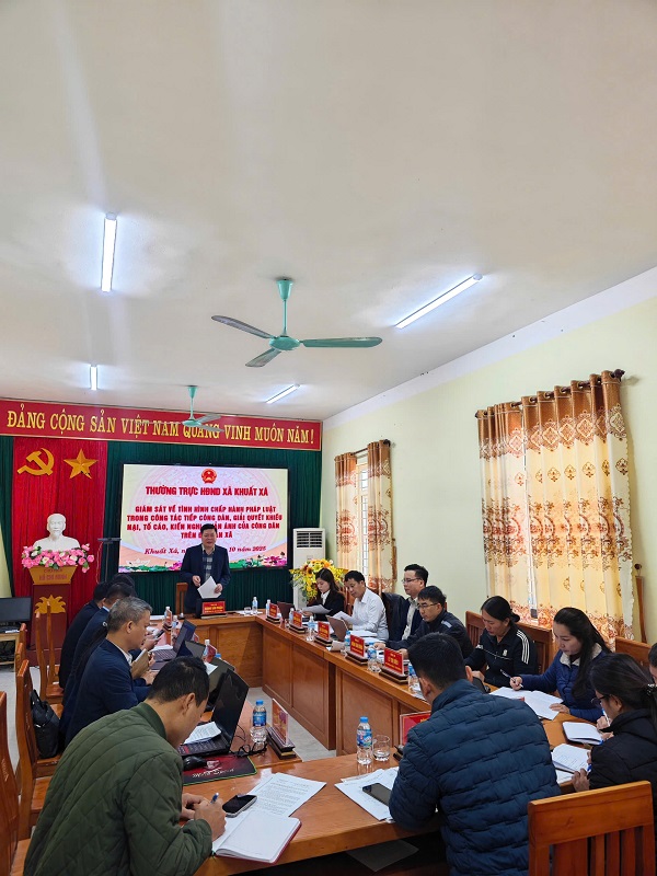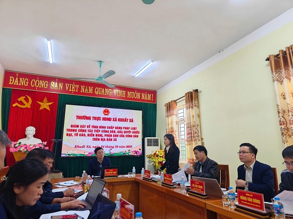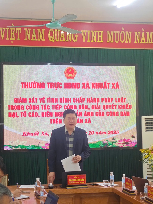 Ngày 24/10/2025, Đoàn giám sát của Thường trực Hội đồng nhân dân xã Khuất Xá do đồng chí Hoàng Văn Thuận, Tỉnh ủy viên, Bí thư Đảng ủy, Chủ tịch HĐND xã làm Trưởng đoàn giám sát về tình hình chấp hành pháp luật trong công tác tiếp công dân, giải quyết khiếu nại, tố cáo, kiến nghị, phản ánh của công dân trên địa bàn tại UBND xã Khuất Xá.